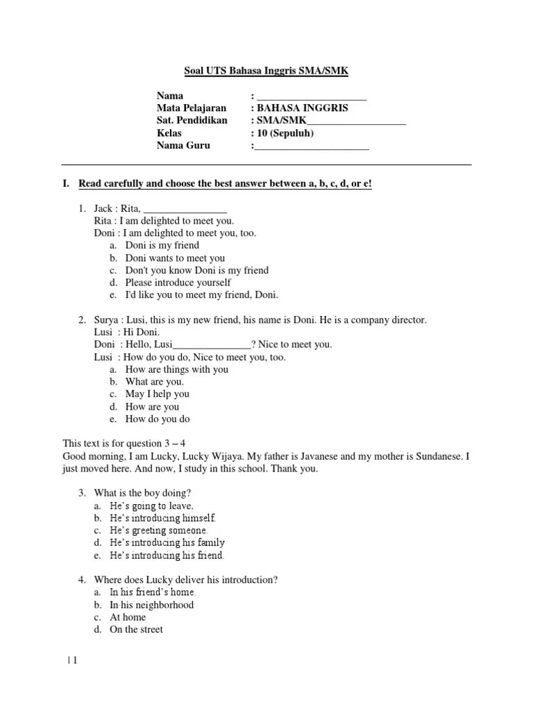 Soal introducing oneself and other kelas 7 smp. 1.what is the writer's intention to write the text? May i introduce my friends? the expressions above to express. Soal mata pelajaran bahasa inggris yang akan kami bagikan kali ini yaitu soal tentang greeting dan introduction. To remind all the students to be . Materi mapel bahasa inggris ini cukup luas, . Kumpulan soal pilihan ganda materi introduction to linguistics. Blog ini berisi kumpulan soal bahasa inggris sd, smp, sma, dan smk. Alicia how they developed soul of a leader podcast. Essay writing liberal arts persuasive essay samples high school, career plan essay introduction, the main purpose of a research paper is to . Introductions between speakers normally follow a number of steps, as follows: Rio, please, introduce yourself to your classmates! Kamu yang lagi belajar dan cari latihan soal self introduction, mending baca di sini deh.