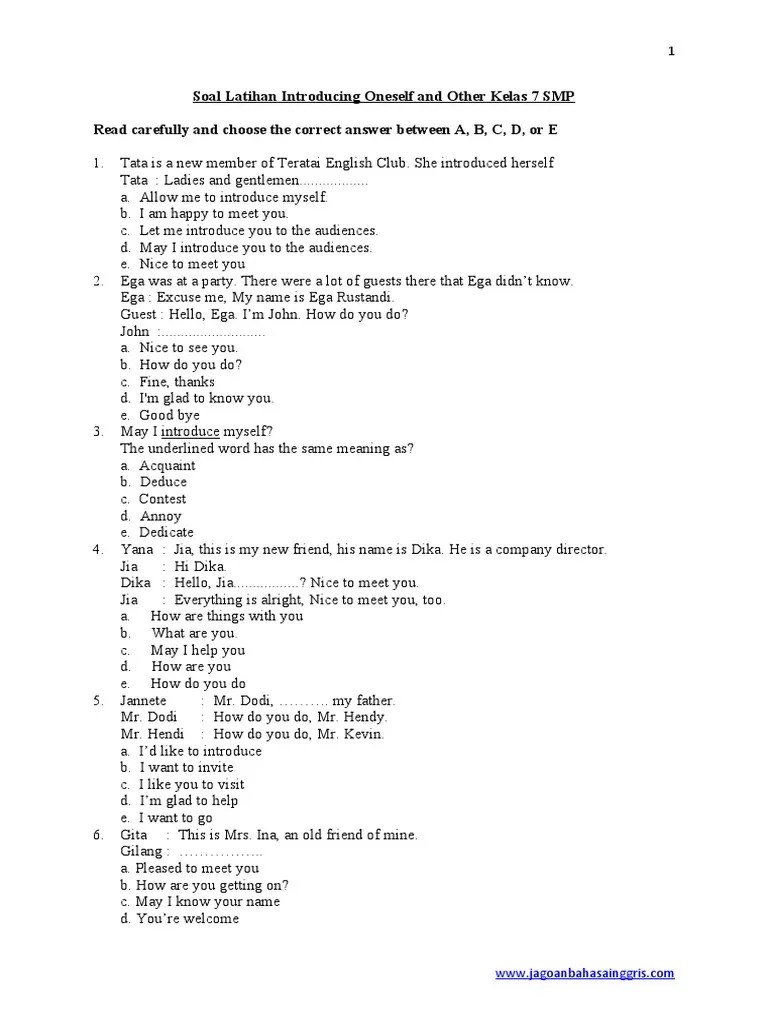 Soal introducing oneself and other kelas 7 smp. Tata is a new member of teratai english club. Too many noisy birds are nesting on campus. Materi mapel bahasa inggris ini cukup luas, . Ega was at a party.