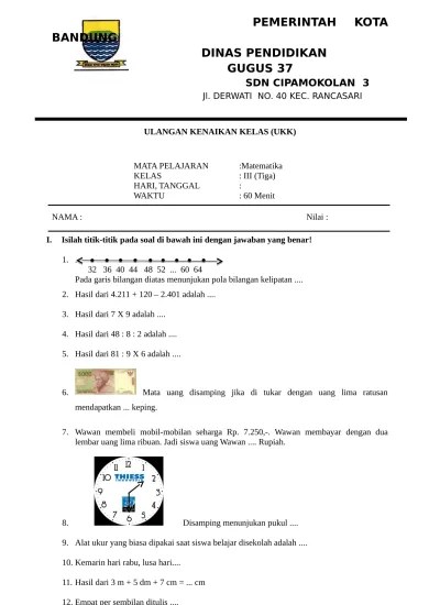 Soal ukk/pat matematika kurikulum 2013 kelas 3, soal dan kunci jawaban ukk/pat matematika kelas 3 kurtilas, contoh soal pat (ukk) matematika sd/mi kelas 3 .